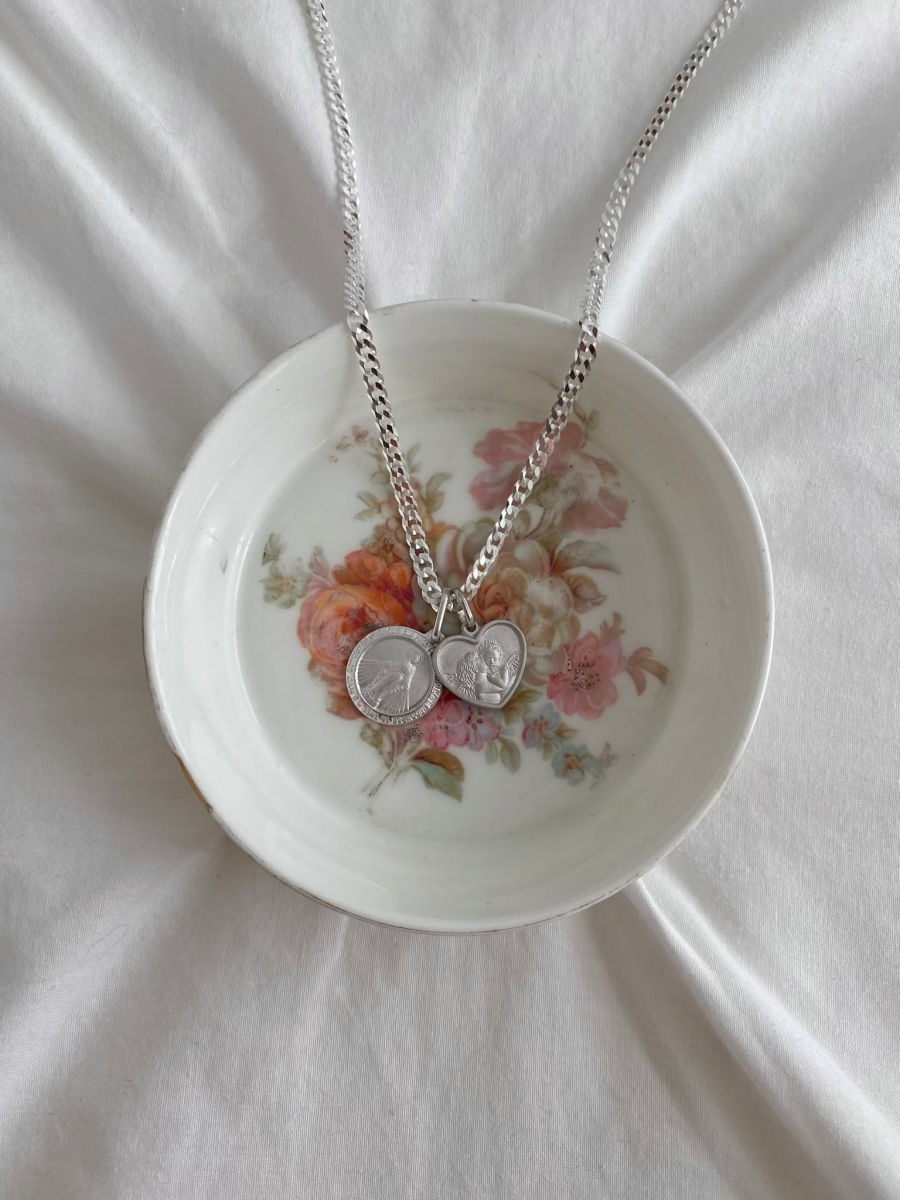 925 sterling silver angel and milagrosa charms on sterling silver curb chain.