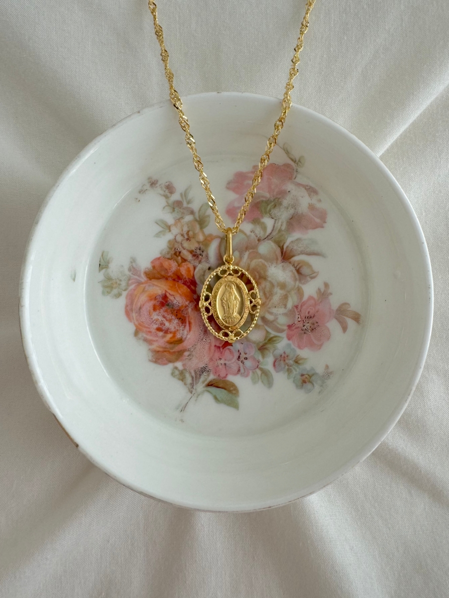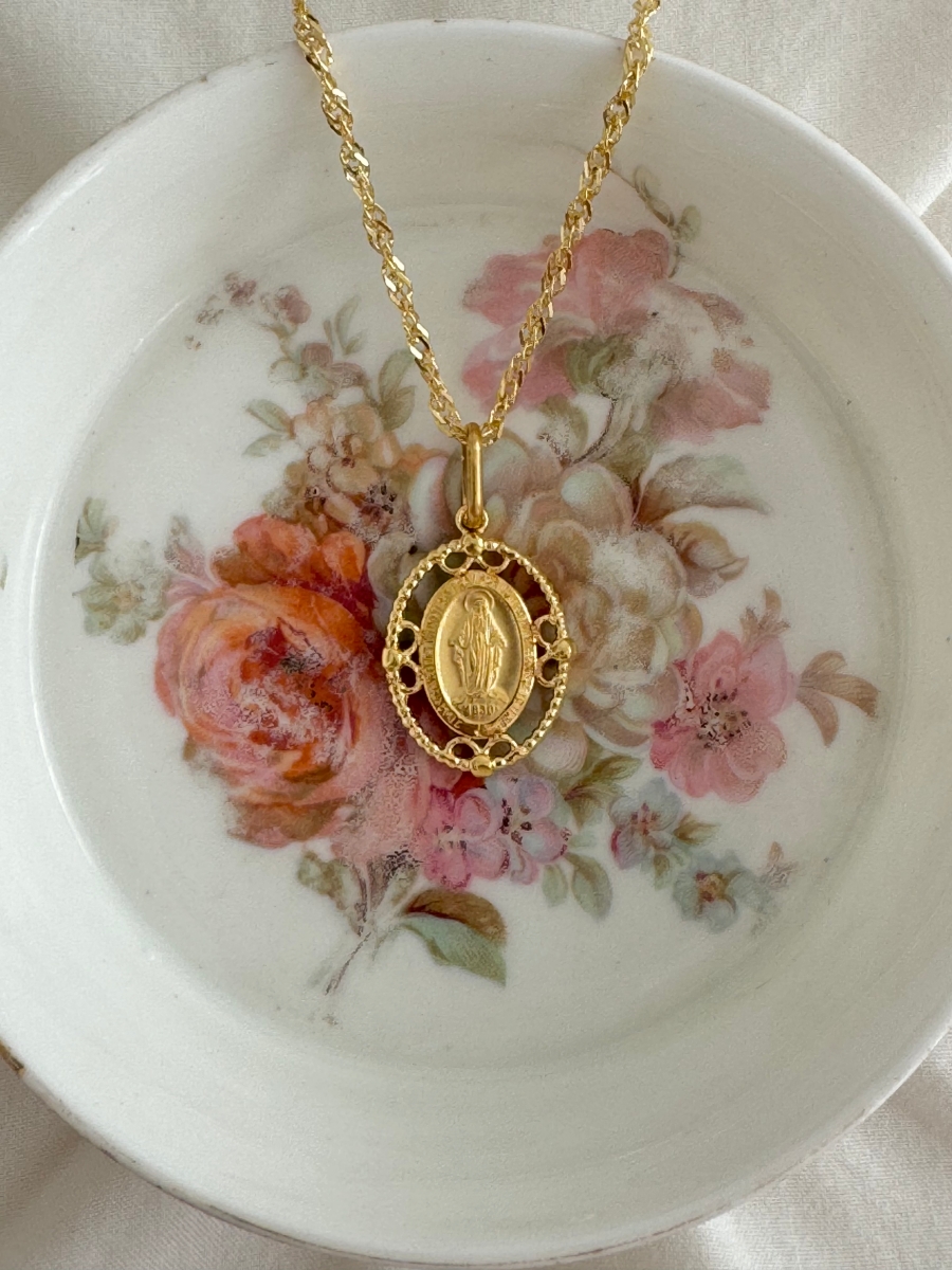 18k gold plated over sterling silver Virgin on gold plated chain.