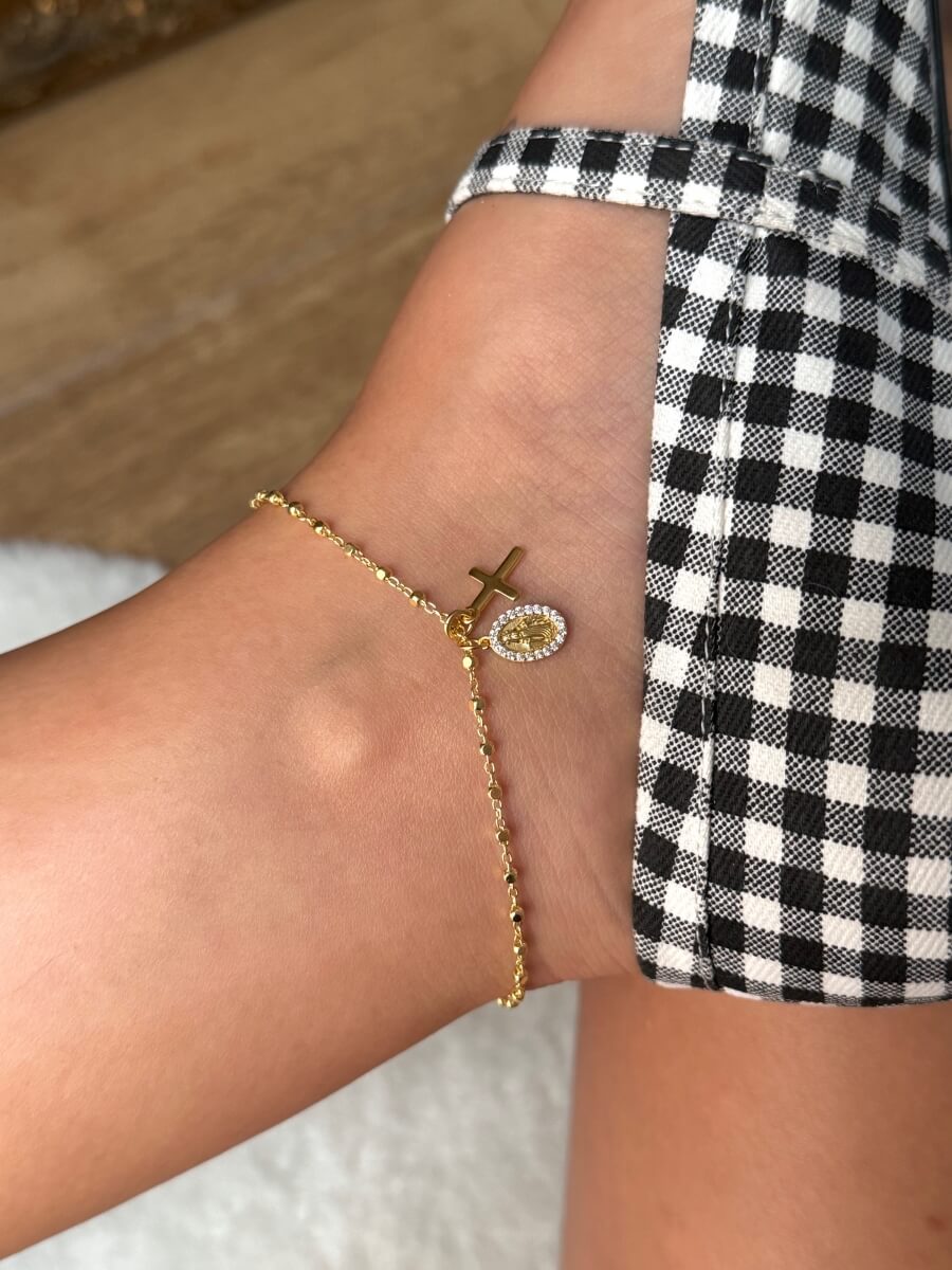 36,00 €18k gold plated over 925 sterling silver chain anklet with a small cross and a Virgin Mary charm.
